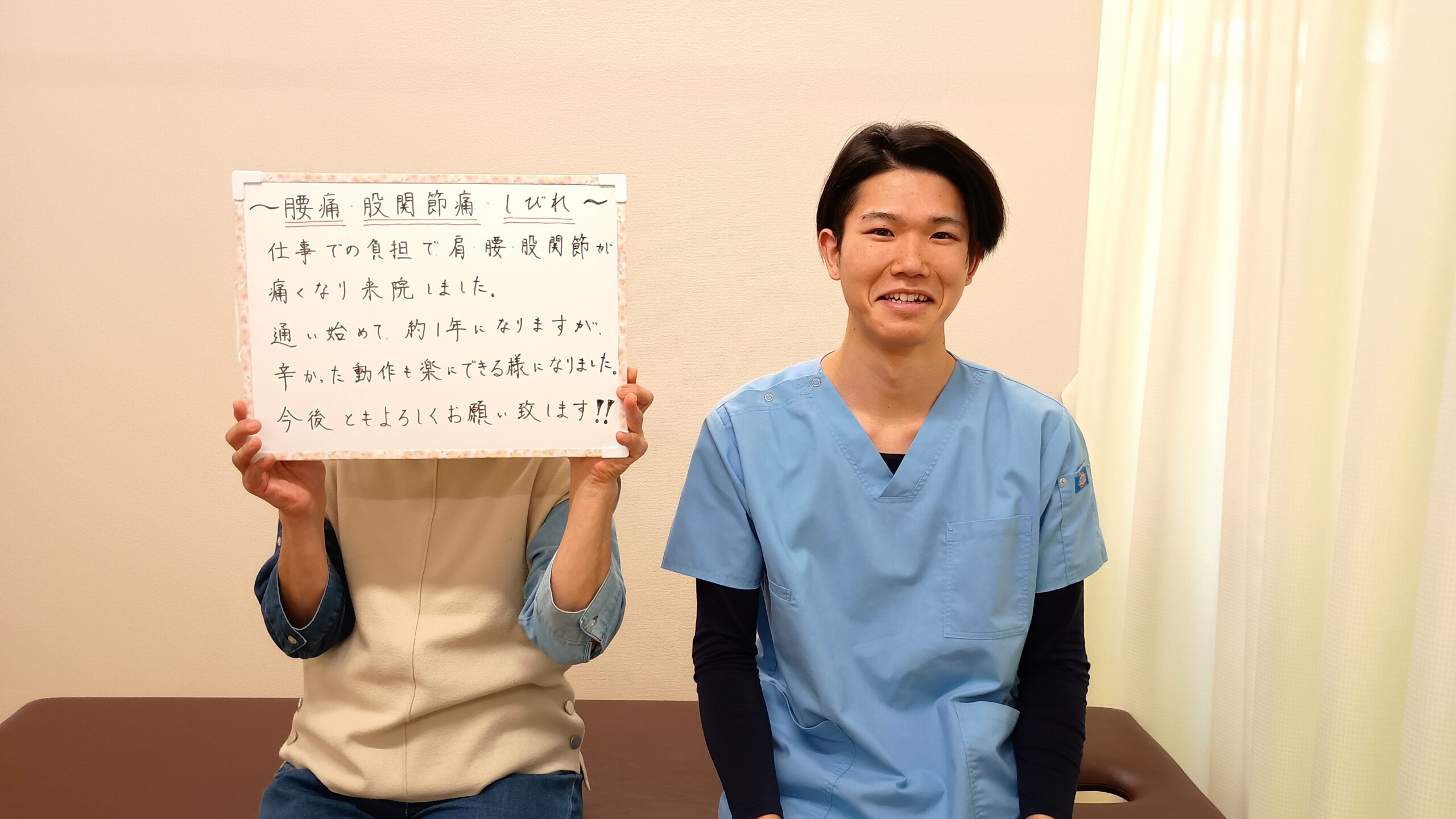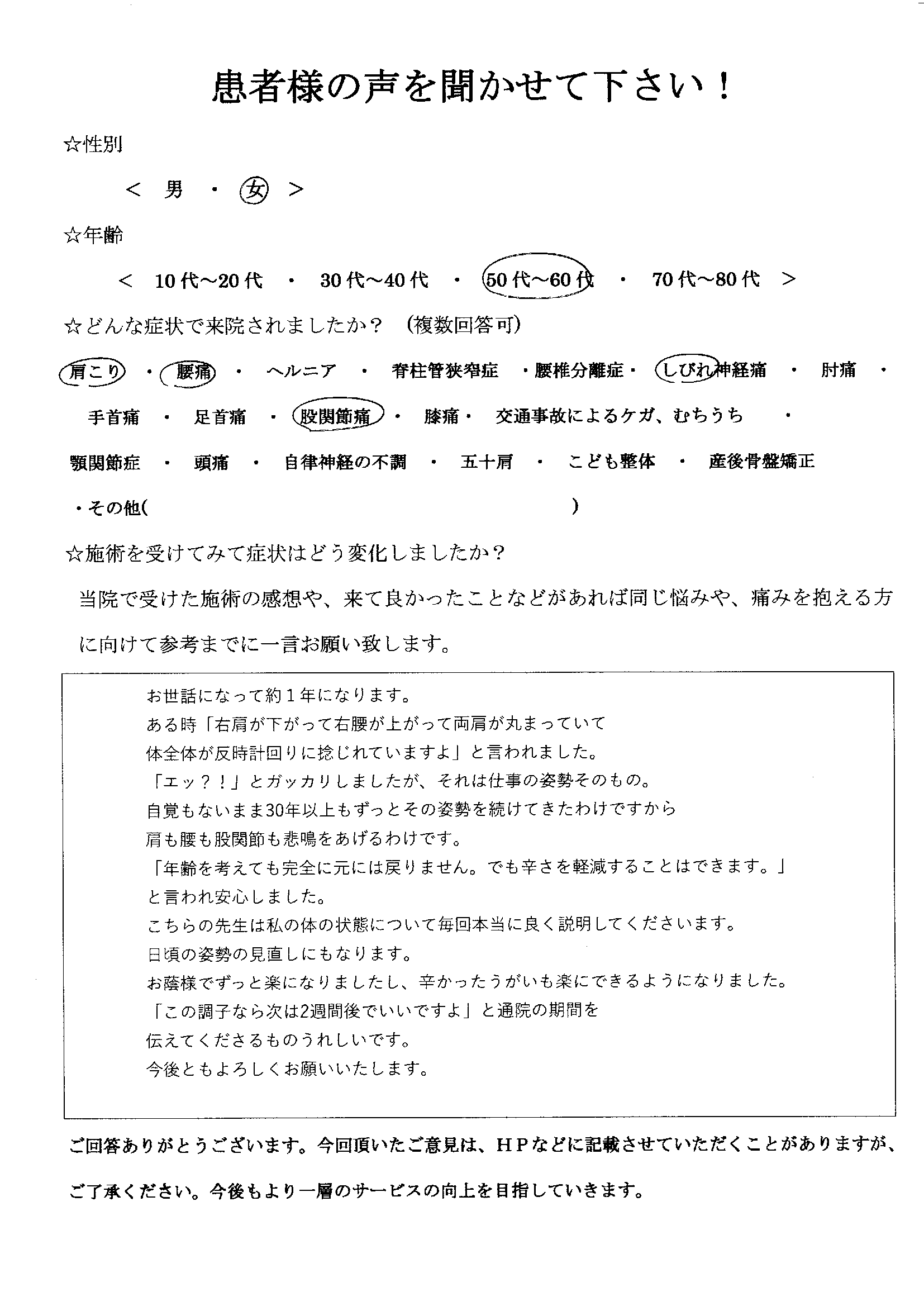 お世話になって約1年になります。ある時「右肩が下がって右腰が上がって両肩が丸まっていて体全体が反時計回りに捻じれていますよ」と言われました。「エッ?!」とガッカリしましたが、それは仕事の姿勢そのもの。自覚もないまま30年以上もずっとその姿勢を続けてきたわけですから肩も腰も股関節も悲鳴をあげるわけです。「年齢を考えても完全には元には戻りません。でも辛さを軽減することはできます。」と言われ安心しました。こちらの先生は私の体の状態について毎回ホントに良く説明してくださいます。日頃の姿勢の見直しにもなります。お陰様でずっと楽になりましたし、辛かったうがいも楽にできるようになりました。「この調子なら次は2週間後でいいですよ」と通院の期間を伝えて下さるのも嬉しいです。今後ともよろしくお願いいたします