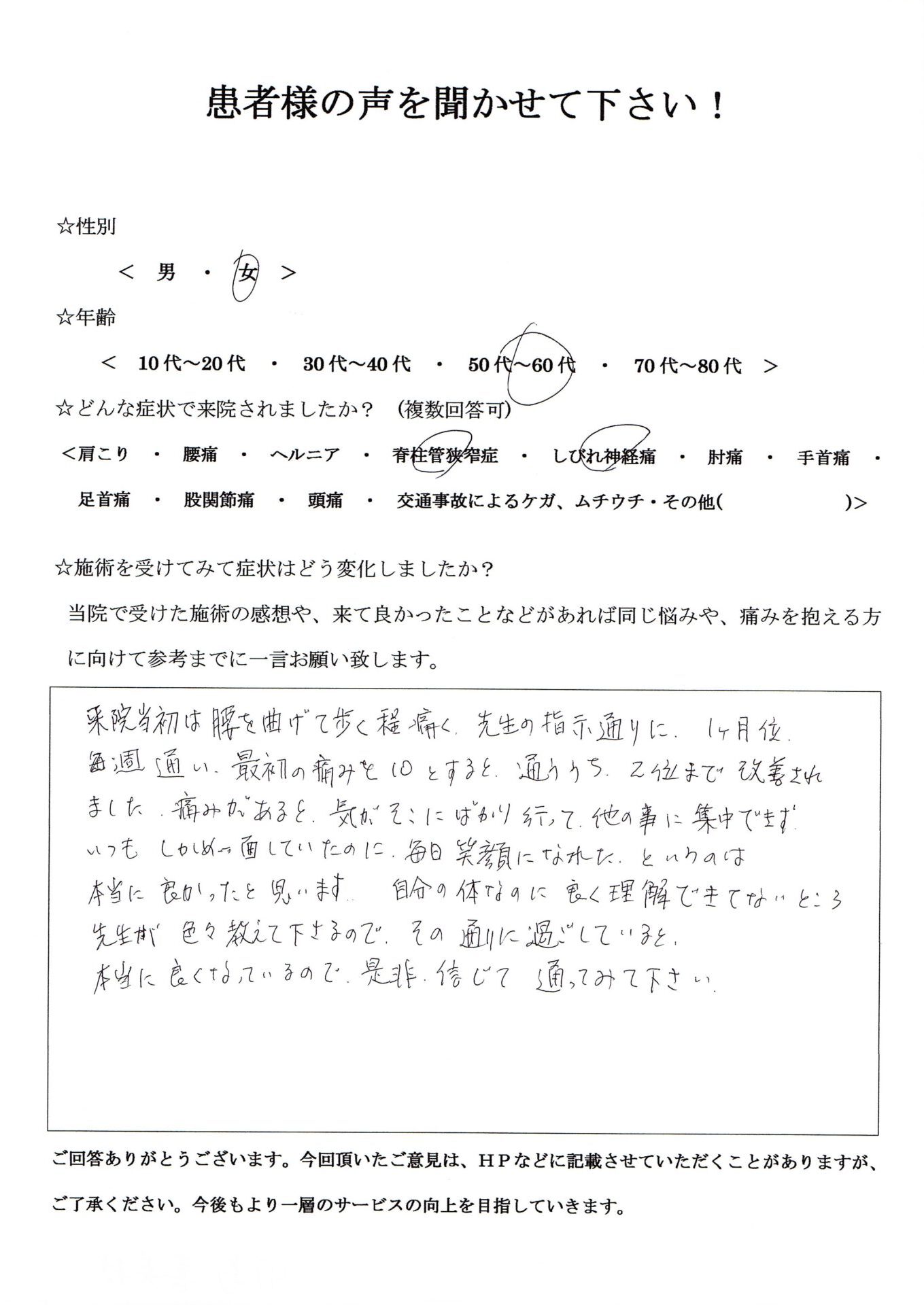 来院当初は腰を曲げて歩くほど痛く先生の指示通りに1ヶ月位毎週通い、最初の痛みを10とすると通ううちに2くらいまで改善されました。